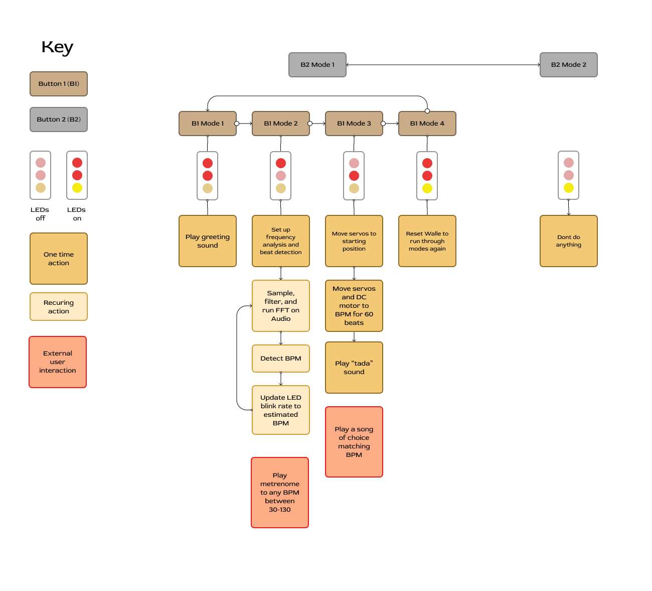 - Mode 2: Wall-E will listen for a metronome beat and run a simple frequency analysis algorithm to determine the bpm being played. Wall-E blinks LED1 to the calculated BPM.